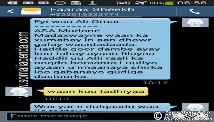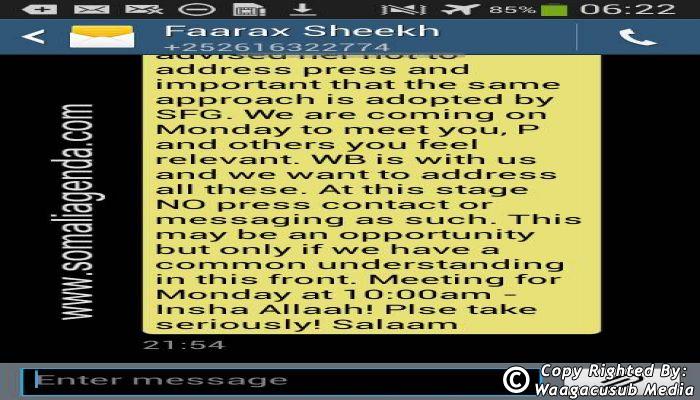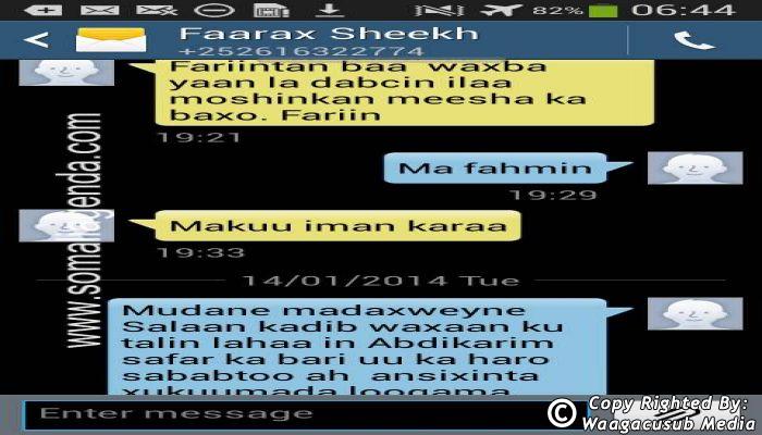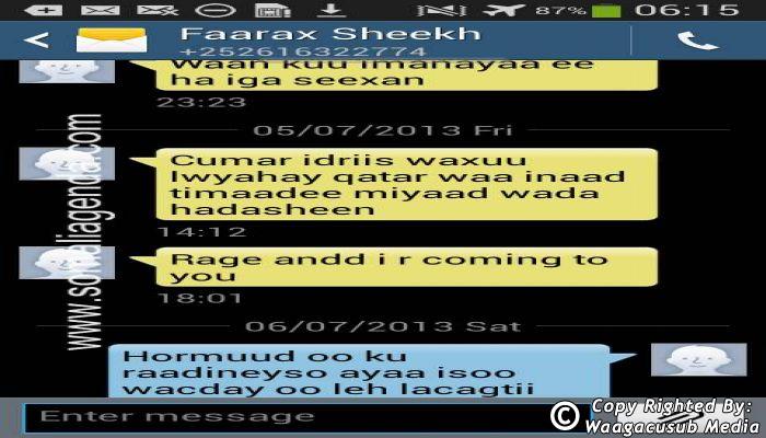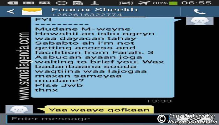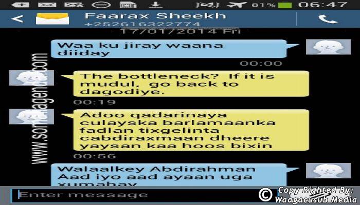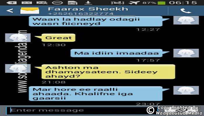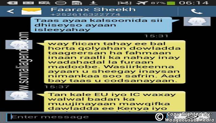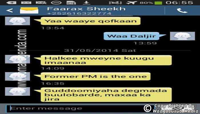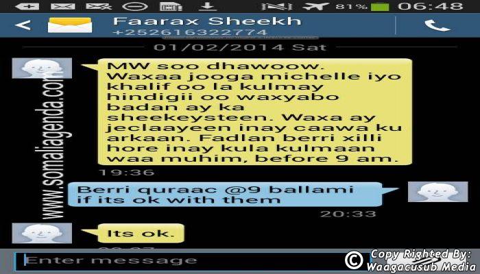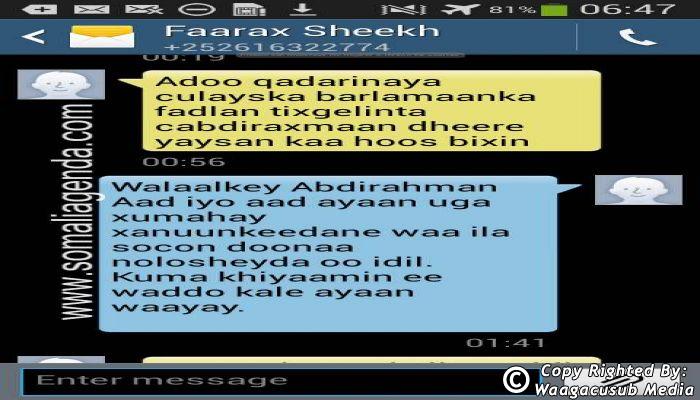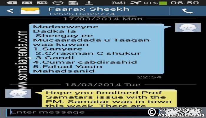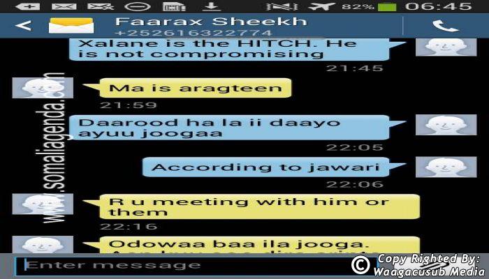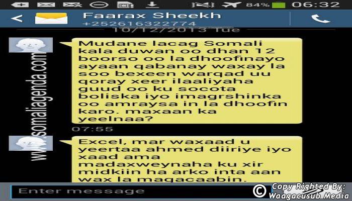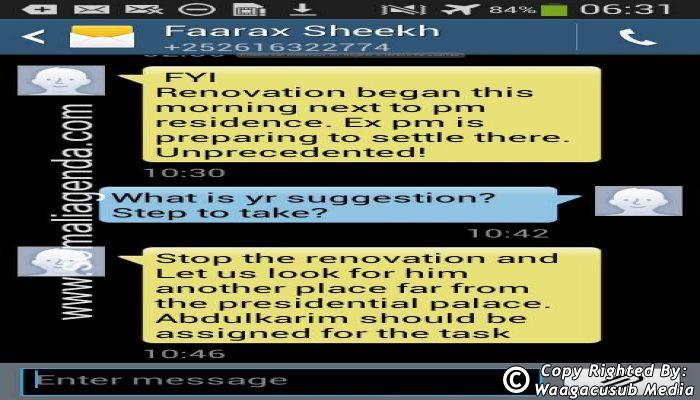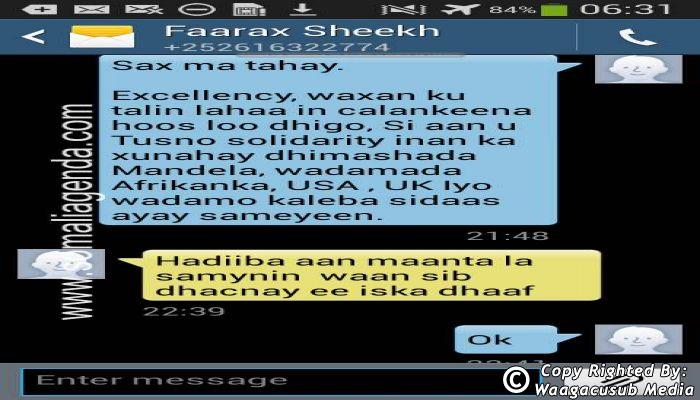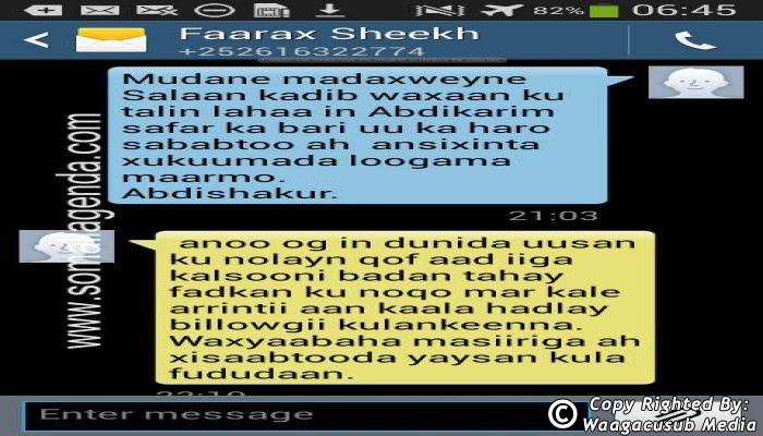SOMALI AGENDA has received and verified the authenticity of series of SMS messages between Somalia's President Hassan Sheikh Mohamud and his powerful Justice and Constitutional Affairs minister Farah Sheikh Abdulqadir.