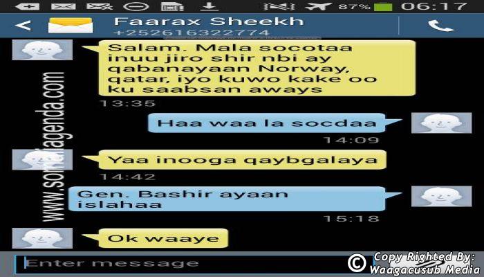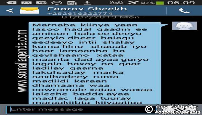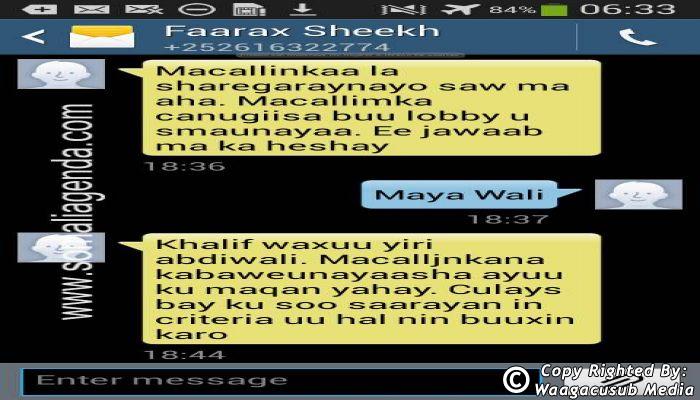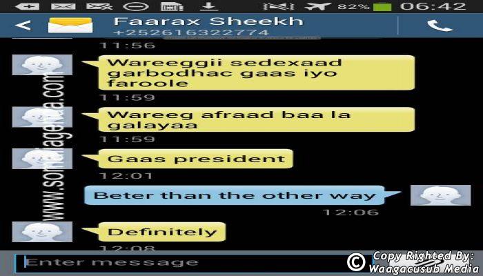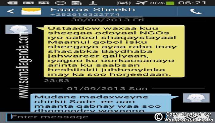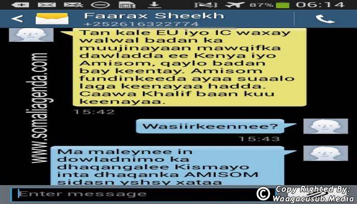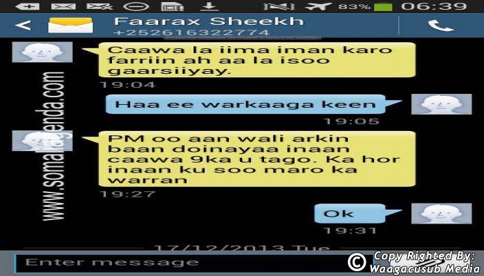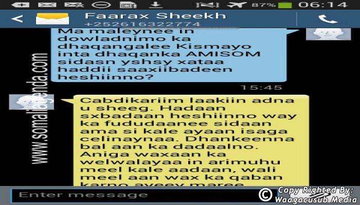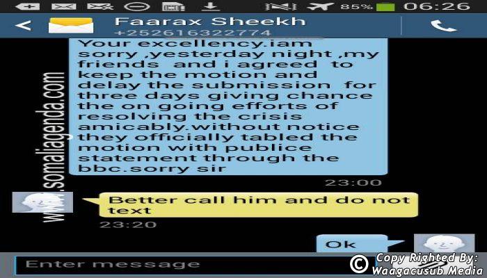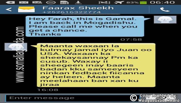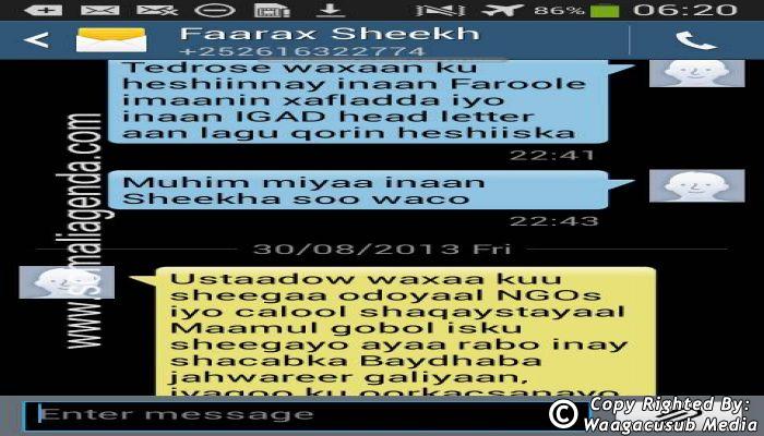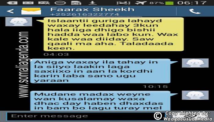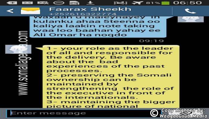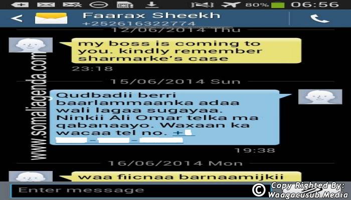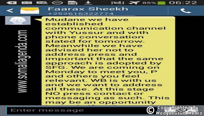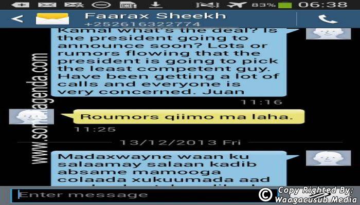 SOMALI AGENDA has received and verified the authenticity of series of SMS messages between Somalia's President Hassan Sheikh Mohamud and his powerful Justice and Constitutional Affairs minister Farah Sheikh Abdulqadir.