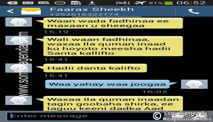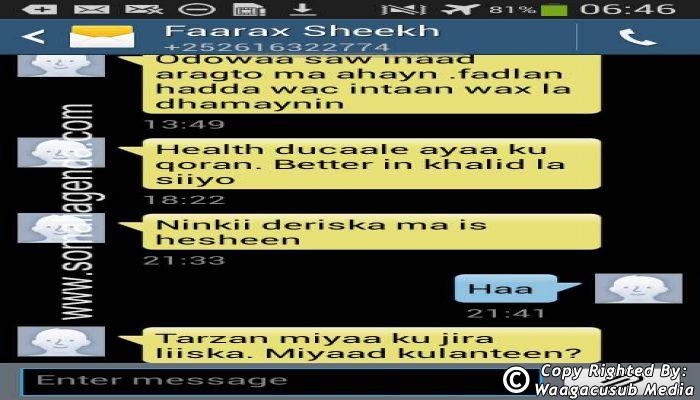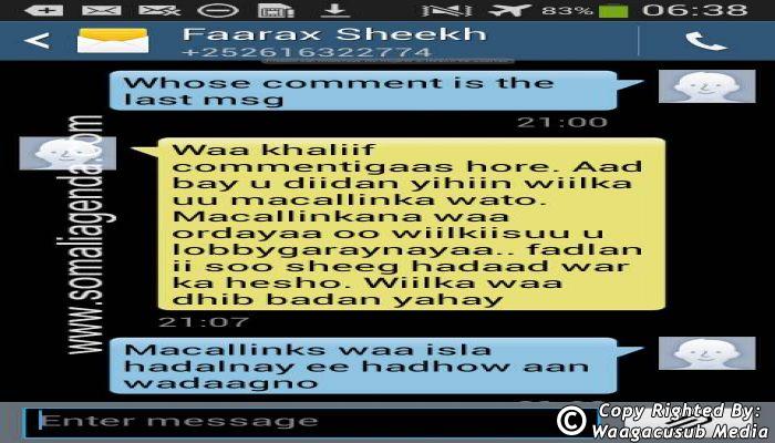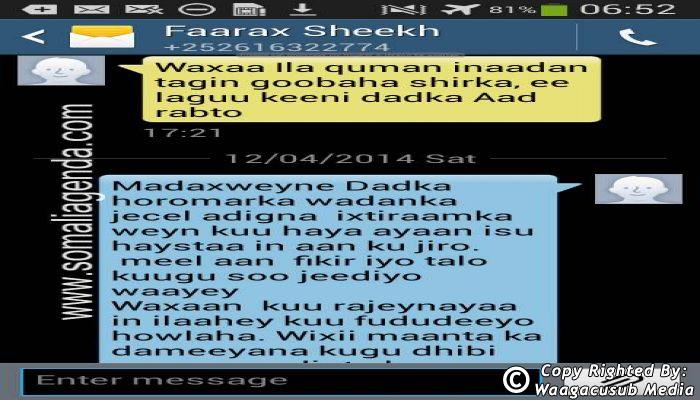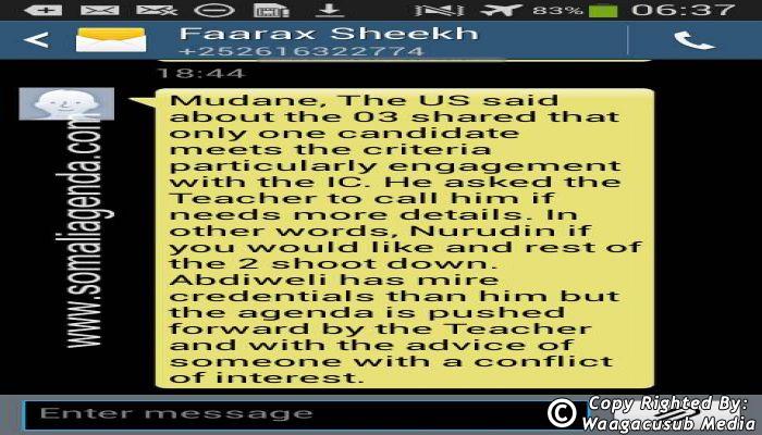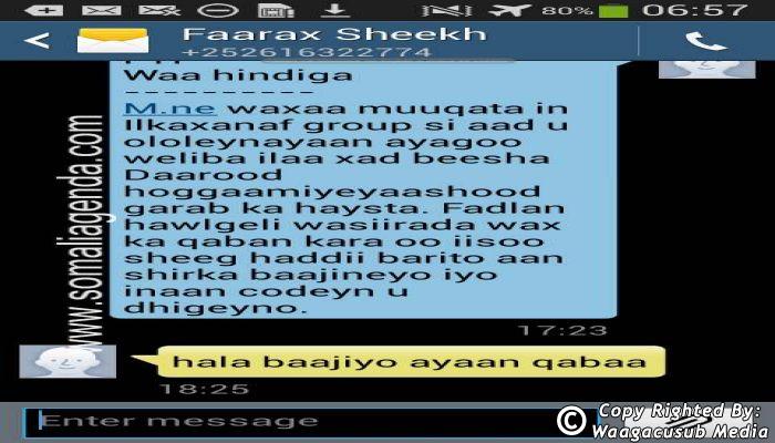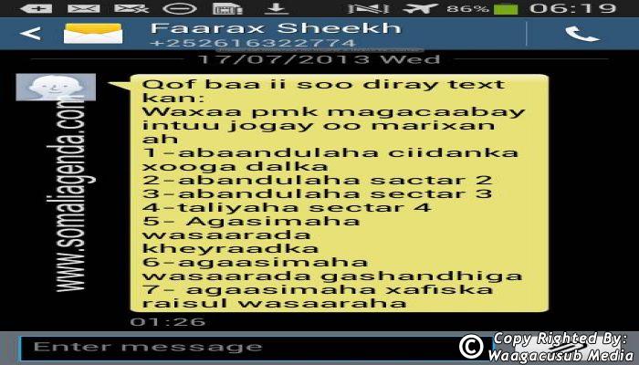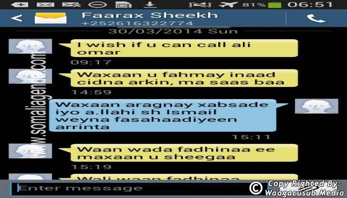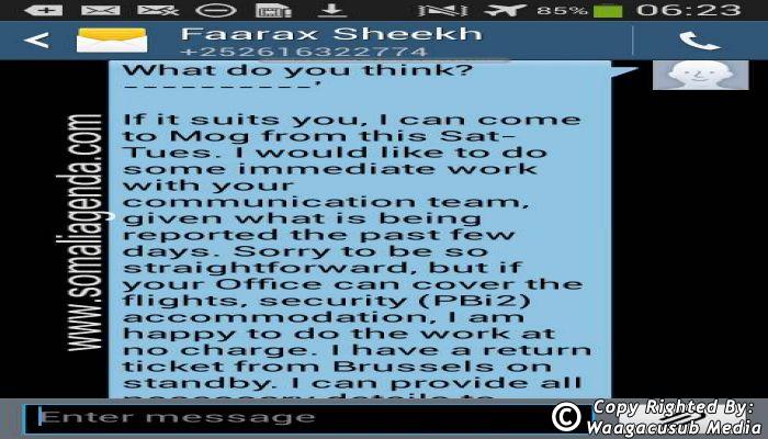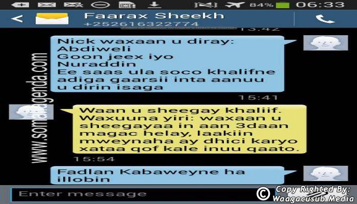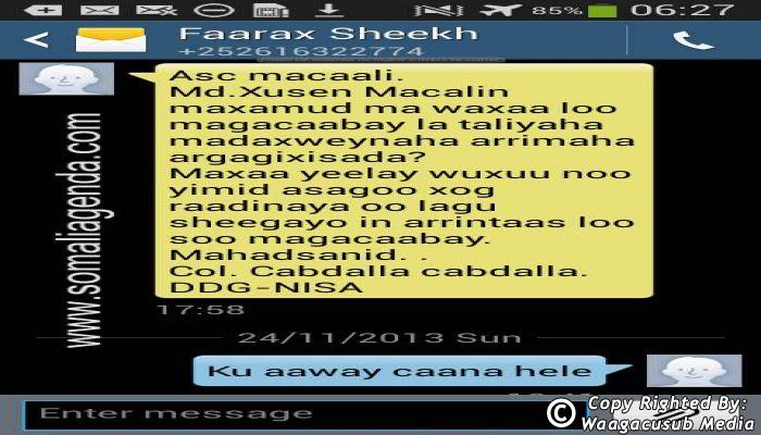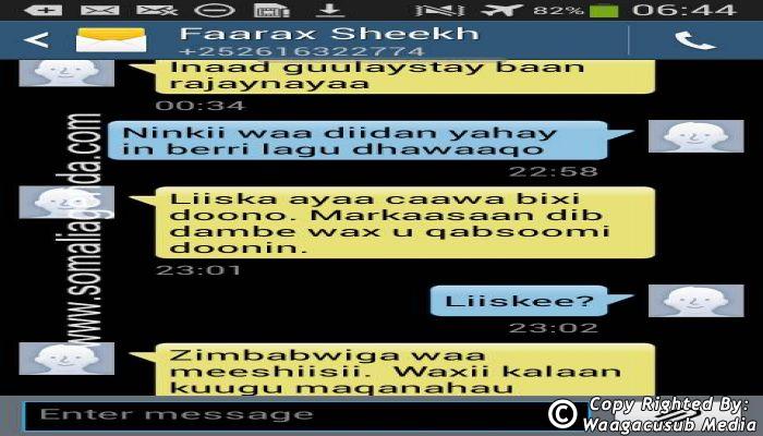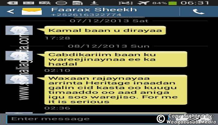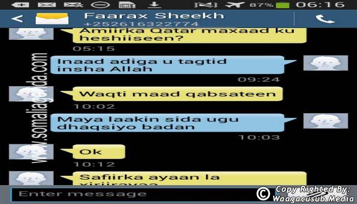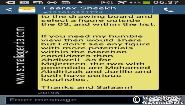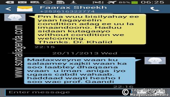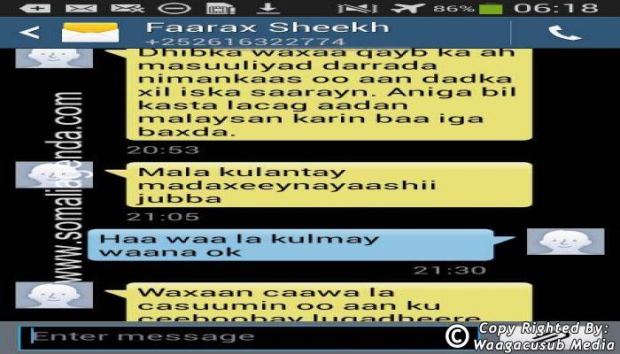 SOMALI AGENDA has received and verified the authenticity of series of SMS messages between Somalia's President Hassan Sheikh Mohamud and his powerful Justice and Constitutional Affairs minister Farah Sheikh Abdulqadir.