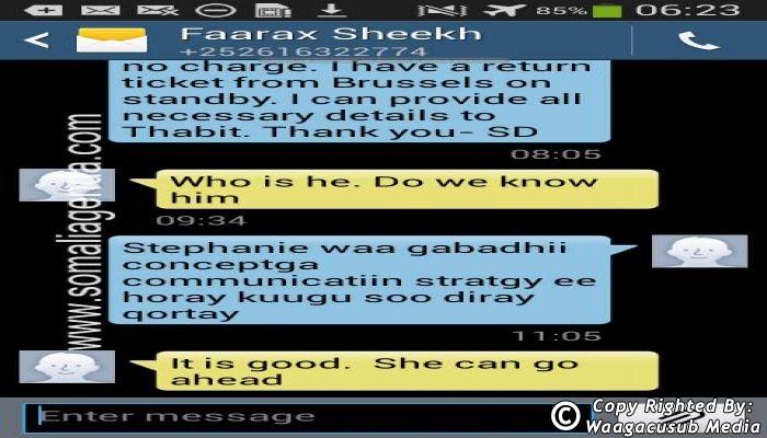 The texts obtained by SOMALI AGENDA are evidence to the magnitude of power Farah Sheikh Abdulqadir holds over President Hassan Sheikh Mohamud. Much of the correspondence between the two shows a remarkable power structure and who is in essence in charge of the decisions. What becomes evident is that there seems to be a tendency from the President’s side to constantly update, verify, and ask for permission from Farah. It is then Farah who will give the go ahead, or disapprove of some of issues which require decision. In principle, it becomes clear that the President is unable to move or decide on issues without approval from Farah. Some might argue that this is not entirely surprising given the role Farah has played in the election of President Hassan Sheikh Mohamud, or is there any other factor that contributes to the docility of the President of the Federal Government of Somalia?